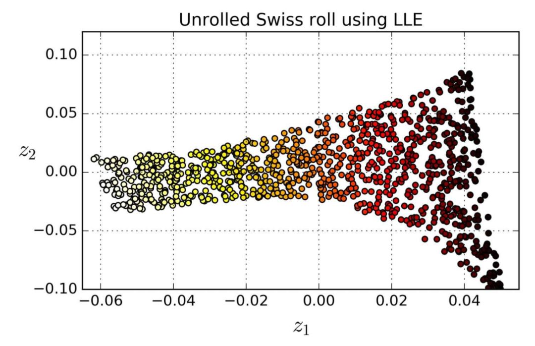 from sklearn.manifold import LocallyLinearEmbeddinglle=LocallyLinearEmbedding(n_components=2,n_neighbors=10)X_reduced=lle.fit_transform(X)