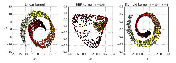 图 8-10 展示了使用线性核(等同于简单的使用 PCA 类),RBF 核,sigmoid 核(Logistic)将瑞士卷降到 2 维。