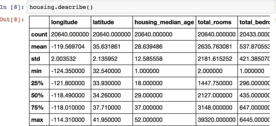 再来看其它字段。describe()方法展示了数值属性的概括(见图 2-7)。