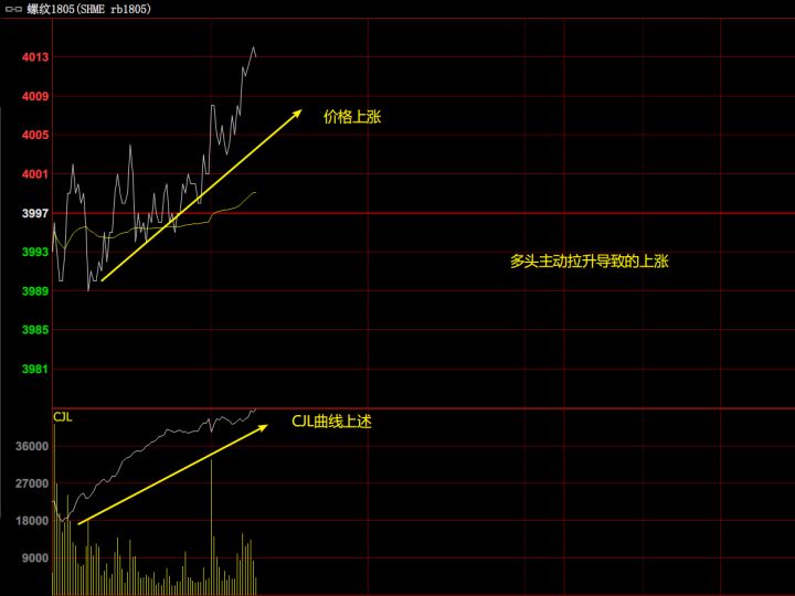 当某个品种价格突然下跌,而CJL指标上涨,成交量放大,这说明是空头主动加仓导致的价格下跌。主要是根据价格与CJL指标之间的关系来判断主力的动向。而在主力有动向的时候,成交量在分时图或者K线图中都会有所放大。