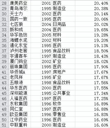 先来看看过去20年回报率前50的公司,采取方式上市就买入一直持有至今,复权方式采取后复权: