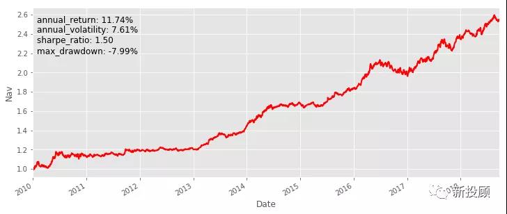 回溯TS组合,历史累计净值及其风险收益指标见图3。可以看到,该组合近8年表现非常优秀,年华收益11.52%,夏普高达1.53[4];风险方面,最大回撤8.19%,年华波动7.28%,属于中等风险水平;另外,该组合并非每年稳定盈利,具有一定的周期性。