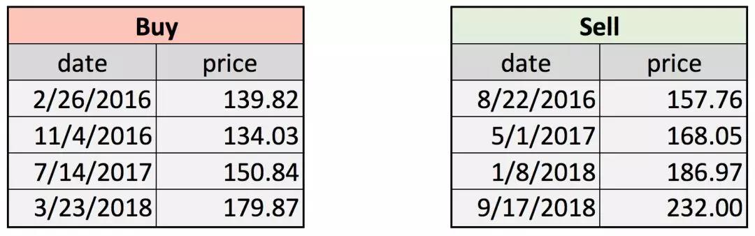 在2015/10/1和2018/10/1期间,我们买卖Costco四次。3年内的回报率为23.2%。 可能不是很吸引人,但至少它是比较乐观的回报。