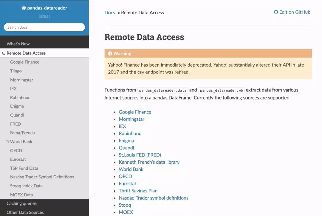 地址:https://pandas-datareader.readthedocs.io/en/latest/remote_data.html