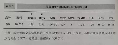 我们在这里采用的带有400小时移动平均过滤的RSI极限与我们前面提到的对应跟随型均值回归量化投资与程序化交易系统是一样的,在CQG中使用的代码也是一致的。我们观察图5.5可发现,由于这个系统在平均值附近平仓,所以相对于趋势跟随型摆动系统来说,我们的平均交易持续时间和在市场中的时间百分比大大的降低了。更让人惊讶的是这个系统的胜率非常的低。