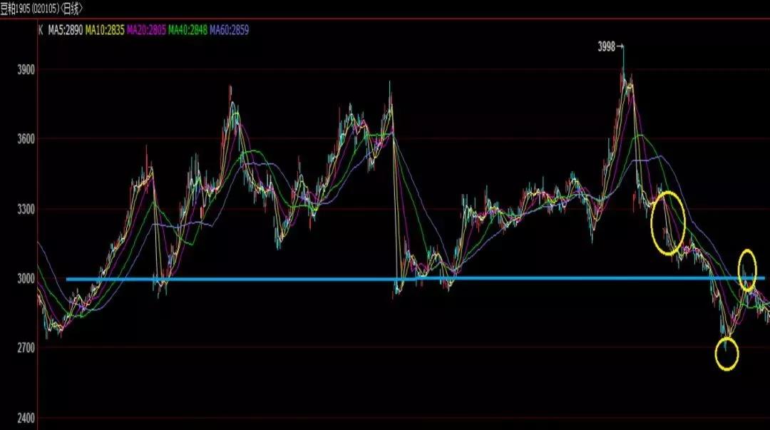如上图所示,在画了一个大黄圈的点位,就是6月30号的一个跳空跌停板。当时我拿的是五月份的空单。在农产品期货里面,豆粕这个品种,做空做五月。为什么做五月呢?第一,五月是美国大豆集中进入中国港口的时候;第二,五月是南美的收获季节,是开始从南美往中国运豆的季节;第三,五月份的豆粕是不能往九月份交割的,所以五月份需要做空。大家可以回过头去看看,空别的月份,不会有这么大的差价。而做多要做九月,因为所有的历史高点,都是在九月合约产生的。利用数据去分析,掌握好价格和时间点,知道什么样的季节会有什么样的行情,这样做起来就相对容易些。