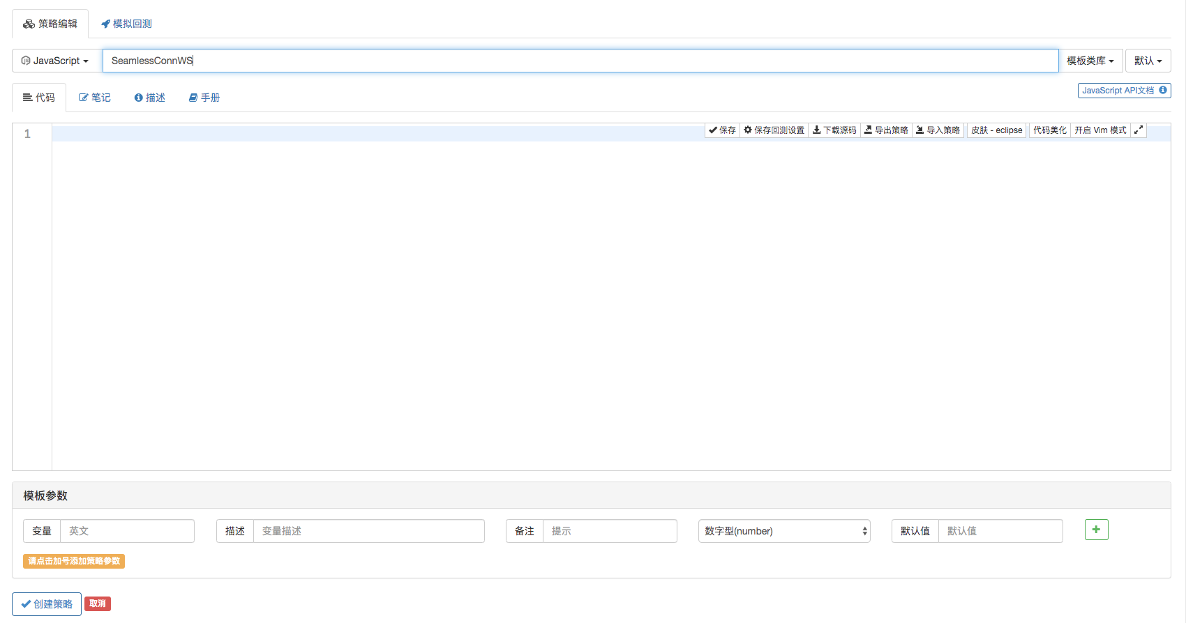 用于控制是否开启使用websocket接口功能,控制指定开启具体的行情接口。本例中因为篇幅有限,只对exchange.GetTicker接口做hook操作。所以参数上就只有开启GetTicker接口为websocket模式的控制参数:Hook_GetTicker。