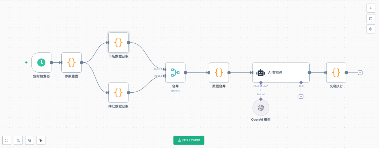 这个AI量化交易系统采用经典的"感知-决策-执行"三段式架构,整个工作流由多个核心节点组成: