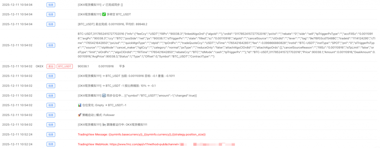 假设你FMZ策略中途停了一会儿,错过了几个信号。以前的方案就完蛋了,持仓对不上。现在的方案不怕——下次TradingView一发信号,FMZ直接按最新状态调整,自动就同步了。
