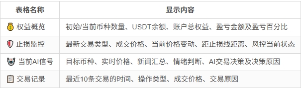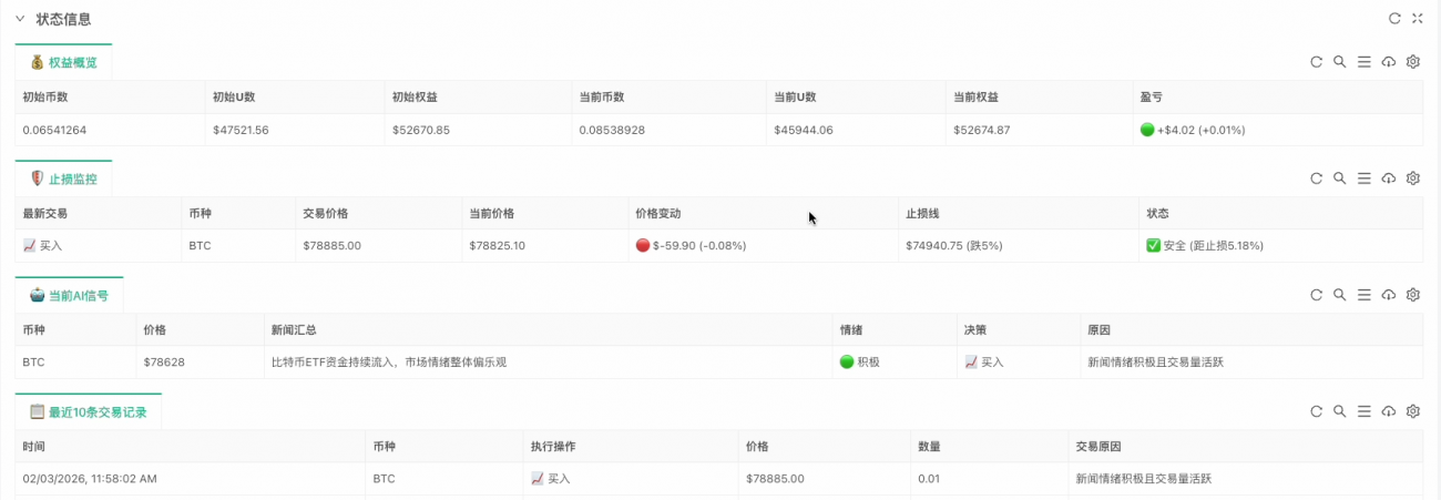 光跑交易不够直观,我们还做了一个可视化仪表板,包含四个核心数据表格,将账户、风控、信号、交易记录一站式展示,系统运行状态一目了然: