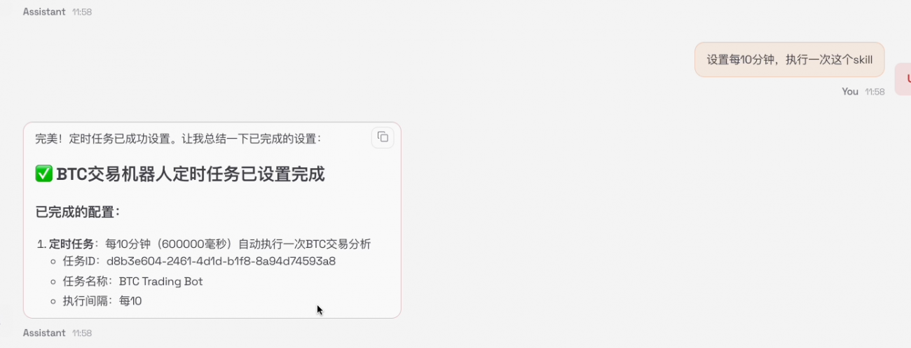 当ClawdBot指导语调试无误、发明者平台代码测试通过后,即可实现系统全自动化运行:在ClawdBot后台将编写好的指导语打包成一个Skill(可复用的AI操作模板),并设置定时任务(如每10分钟执行一次),系统便会按设定频率自动采集数据、分析决策、发送信号,发明者平台则实时监听并执行交易,全程无需人工盯盘。