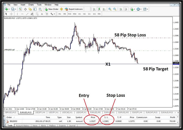 图中的止损和止盈都是58 点。这种交易的可能性很高,几乎每天都有这样的机会。如果每次交易都如此设定,那么成功率只要超过50%,长期就能盈利。