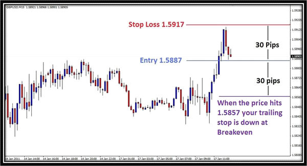 图中卖单的开仓价位是1.5887,止损价位是1.5917,止损30 点。经纪商要求追踪止损至少要30 点,所以当价位降到1.5857 时止损被移到开仓位1.5887,此时追踪止损才正式启动。如果想避开这个限止可请人编写一个程序执行追踪止损。用追踪止损平仓可以在锁定盈利的同时留下足够的空间,以免被市场的小小波动止损。