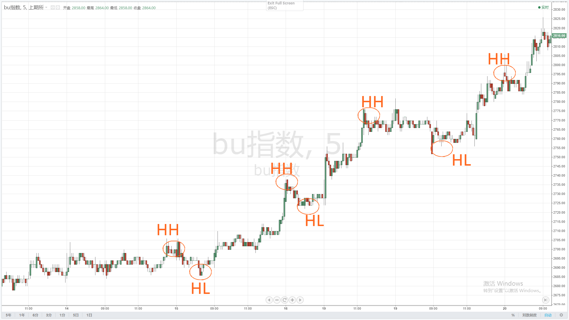 从 Price Action 的视角简单看一下市场,找一个重复的形态:上升趋势中的更高的高点(Higher Highs ,HH)和更高的低点(Higher Lows,HL),和下降趋势中的更低的高点(Lower Highs ,LH)和更低的低点(Lower Lows ,LL)。下面是一个典型案例。这是一个典型的上升趋势,其中包括了很多重复的更高的高点(HH)和更高的低点(HL)……