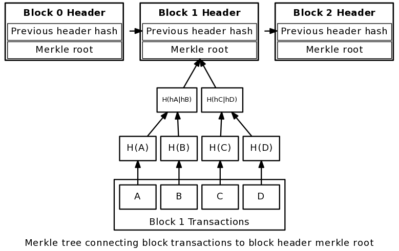 在区块链中很多地方用了哈希算法,比如对区块计算哈希值。在“区块链基础”部分中实现了一个简化版的区块链。在实际区块链中区块包含元数据的区块头和紧跟其后的构成区块主体的一长串交易,结构如下: