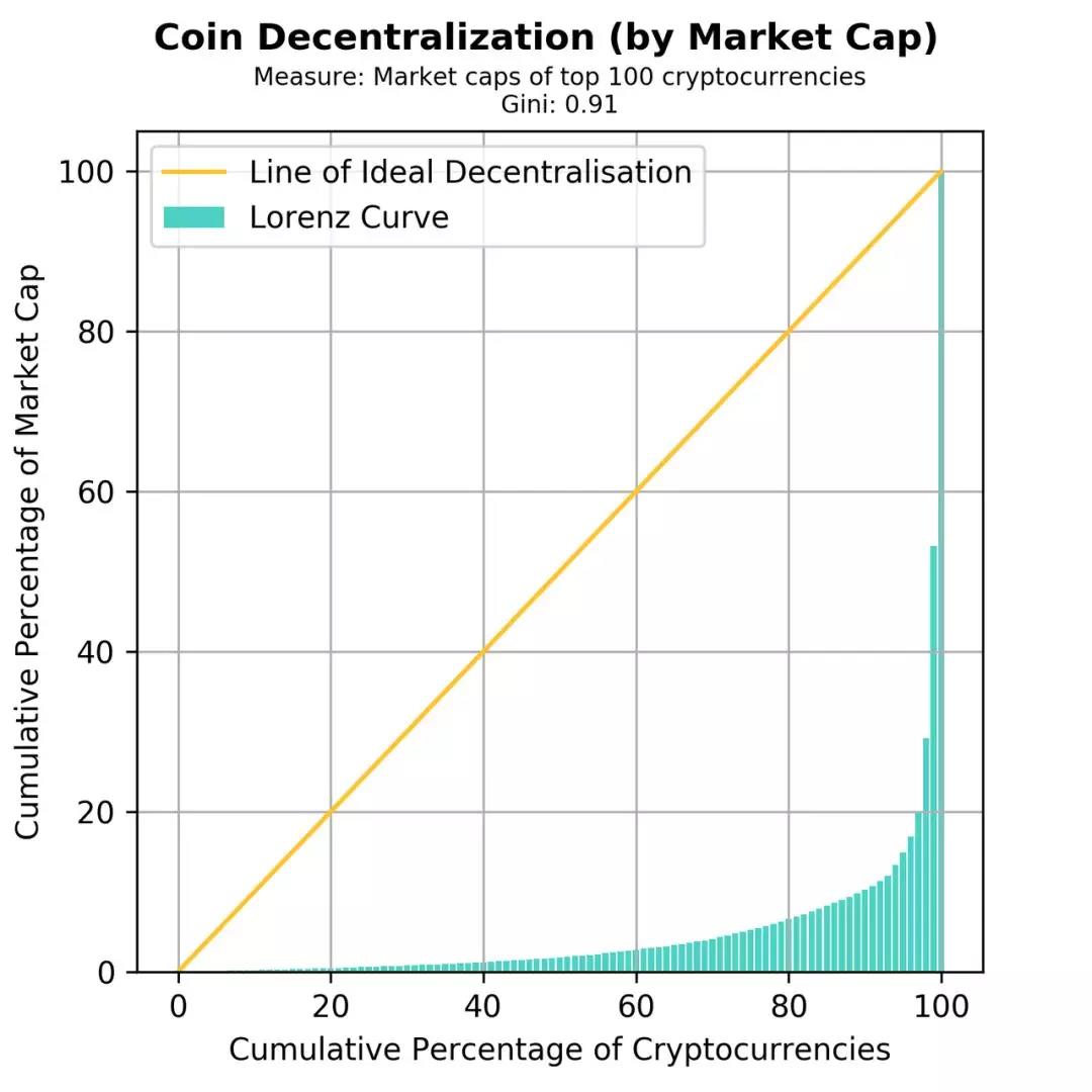 如果我们衡量前 100 名数字货币市值的中心化程度,基尼系数是 0.91。这和我们的直觉知识相符合,因为自 2017 年 7 月起,整个市值的 70% 被名列前 2 名的数字货币持有,即比特币和以太坊。