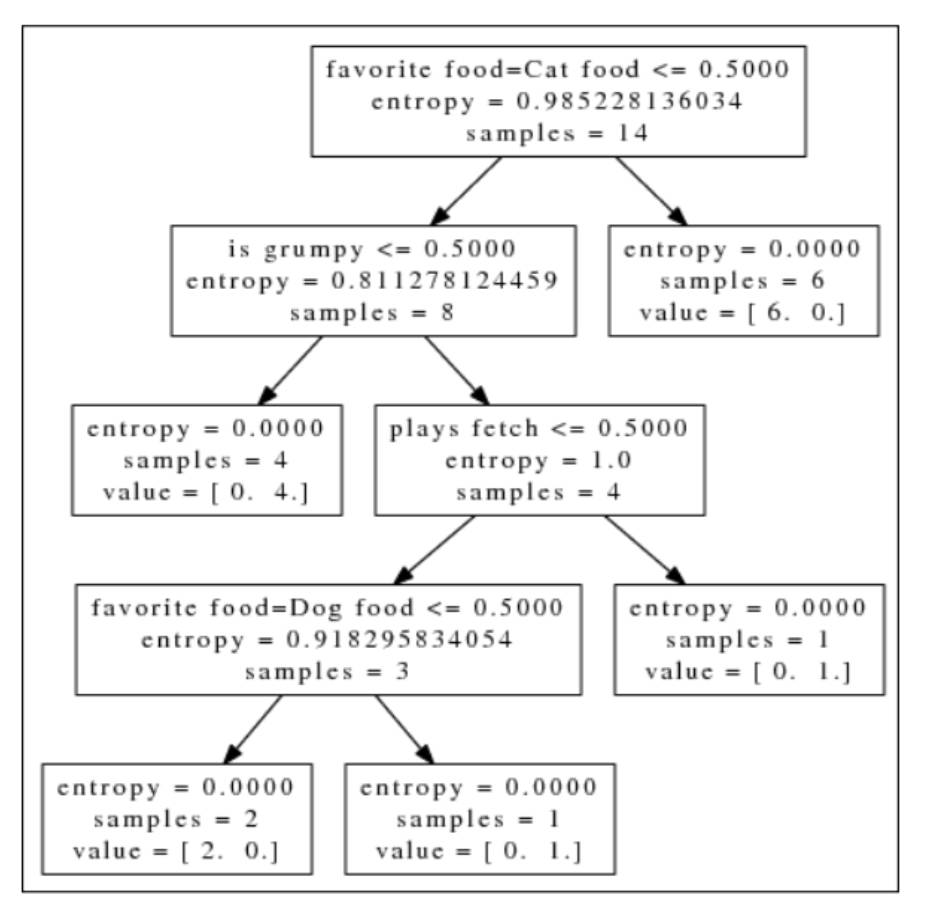 从数据中我们发现, 猫比狗更容易发脾气。大多数狗玩球, 而猫不爱玩。狗更喜欢狗粮和培根, 而猫喜欢猫粮和培根。解释变量是否喜欢玩球和是否经常发脾气可以转换成二元特征值。解释变量最喜欢的食物可以转换成一个具有三个可能值的分类变量, 可以用热独编码[1,0,0], [0,1,0], [0,0,1]表示, 具体方法在第三章已经介绍过。通过上面的分析, 我们可以构建模型的规则。例如,一个动物如果经常发脾气且喜欢吃猫粮那就是猫, 如果喜欢玩球且爱吃培根就是狗。在这么小的训练集里, 想手工逐条构建规则也是非常麻烦的事情。因此, 下面我们来构建决策树。
