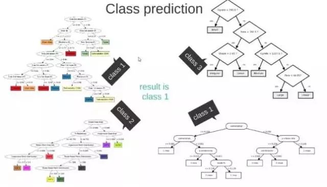 下图,左右两个决策树,单个看是效果不怎么好的,但是把同样的数据投入进去,把两个结果加起来考虑,就会增加可信度。