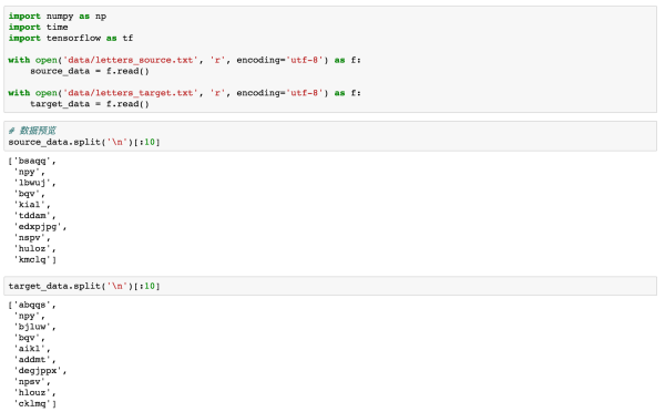 - target_data: 每一行是经过字母排序后的“单词”,它的每一行与source_data中每一行一一对应