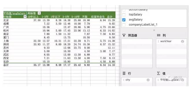 聪明的你可能已经想到,我们常用的数据透视表就是一种维度分析,将需要分析的维度放到行列组合进行求和、计数、平均值等计算。放一张曾经用到的案例图片:用城市维度和工作年限维度,计算平均工资。