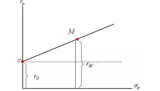 图中的r0是无风险收益,直线的斜率就是夏普比率。另外实际生活中,加杠杆,也就是借钱一定需要支付利息,于是,正常的图形应该会有个折点。