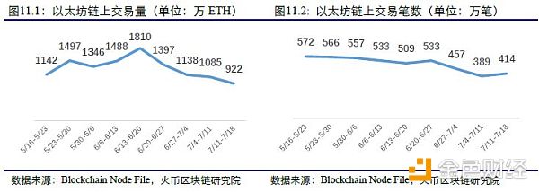 本周以太坊活跃地址数增加11.3%,从108.9万升至121.2万,继前两周大幅的下降后有所反弹,但仍处于近期低点;交易量较上周下降15%,至922万ETH,已连续下降四周;链上交易笔数为414万笔,上升6.4%;TPS为6.8,上升6.3%;转账手续费从3.3万ETH下降至2.2万ETH;平均手续费下降38%至0.0053ETH,但仍处于近期高点;以太坊地址持币集中度较上周大幅上升;本周以太坊无单笔5万以上ETH的超大额转账,1万以上的ETH交易量比例略有下降,一万以下的交易量比例略有上升。