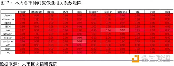 本周市场呈现明显的同涨同跌行情,各数字货币之间的皮尔逊相关系数普遍非常高。相关度最低的为ADA(cardano)和EOS,二者间相关系数也还是高达0.92。