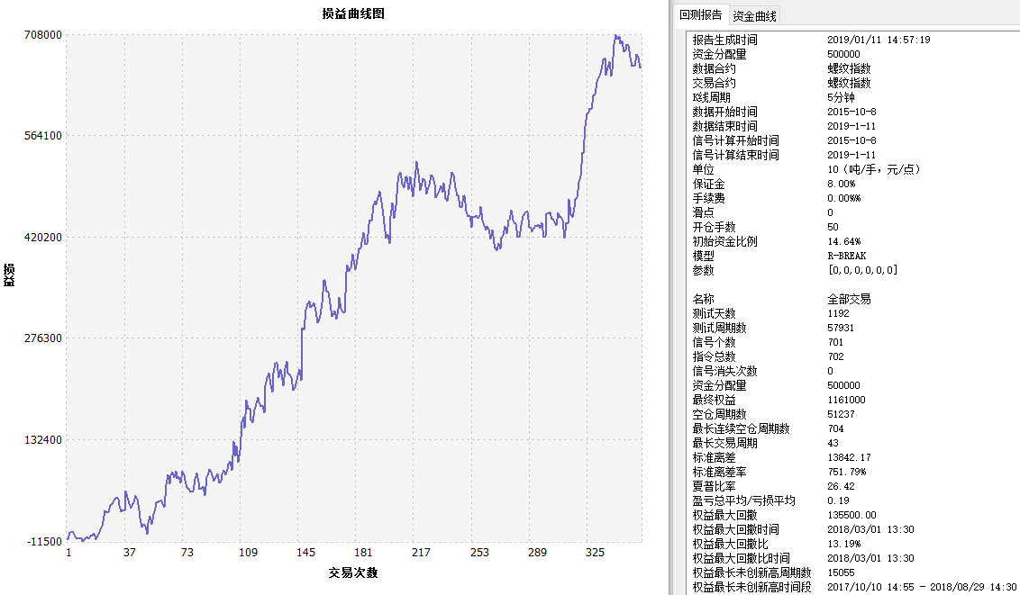 商品期货经典R-BREAK策略 测算报告 ------------------------------- 名称 全部交易 多头 空头 报告生成时间 2019/01/11 14:57:19