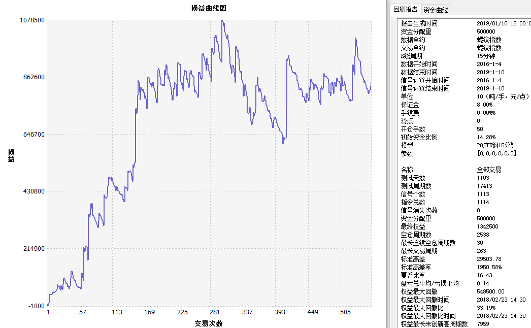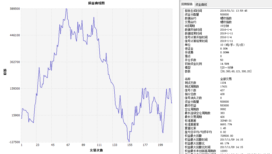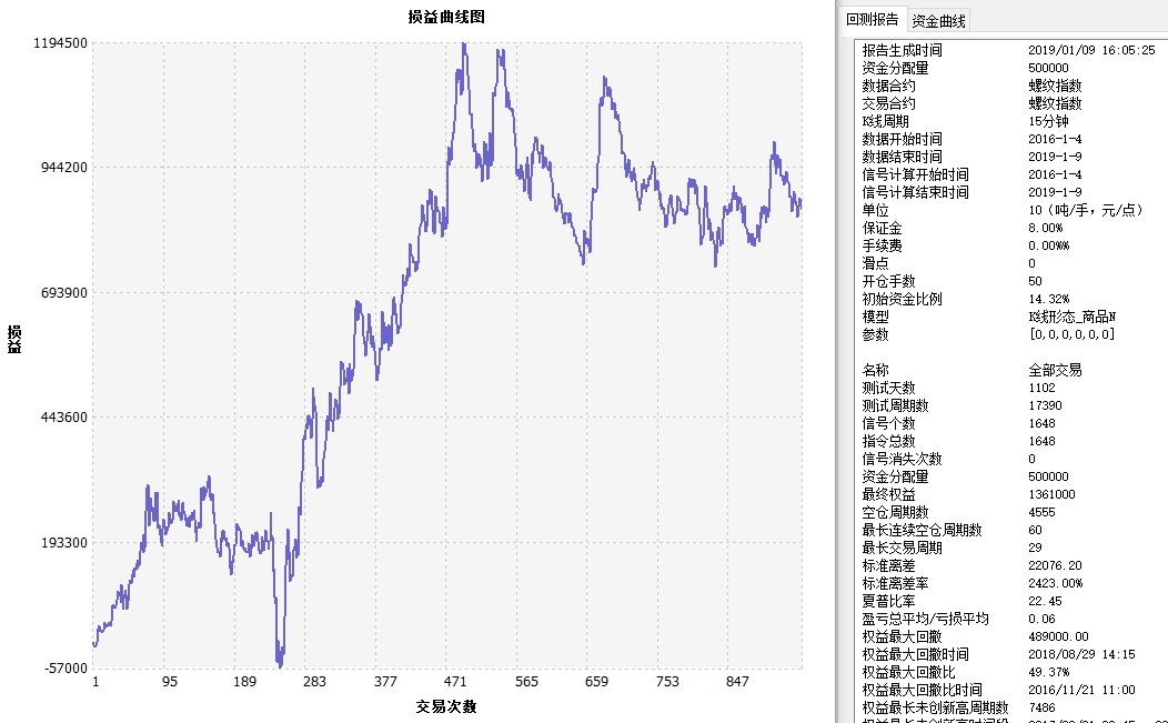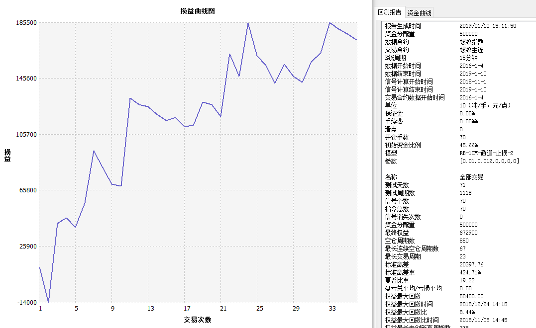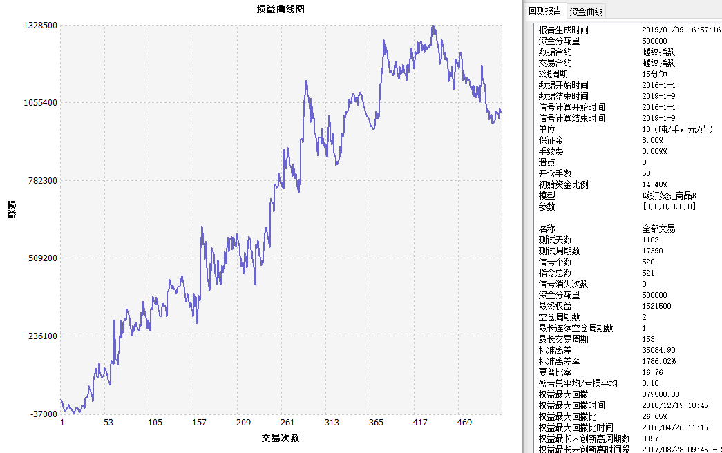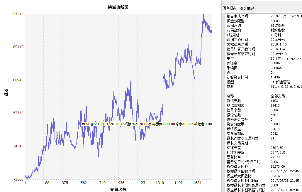 SAR指标资金管理策略 测算报告 螺纹指数 15分钟 SAR资金管理 ------------------------------- 名称 全部交易 多头 空头 报告生成时间 2019/01/10