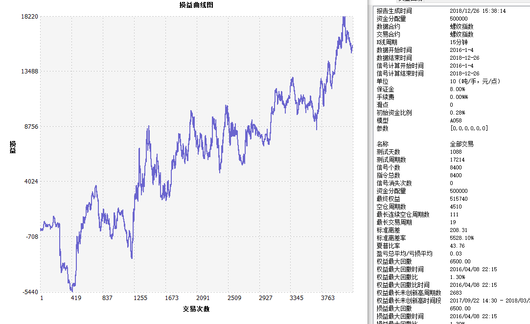 基于日线最高最低价的日内突破策略,限制最多加仓次数。 测算报告 ------------------------------- 名称 全部交易 多头 空头 报告生成时间 2018/12/26 11