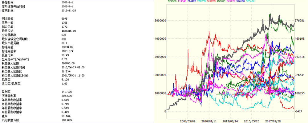 从上图的回测资金曲线上看,整体测试曲线比较良好。每年都是盈利的。胜率超过50%,趋势策略的胜率通常不会太高,一般情况下都在30%~40%左右。平均盈利/平均亏损为3.42,这个比值大于3,是比较好的。